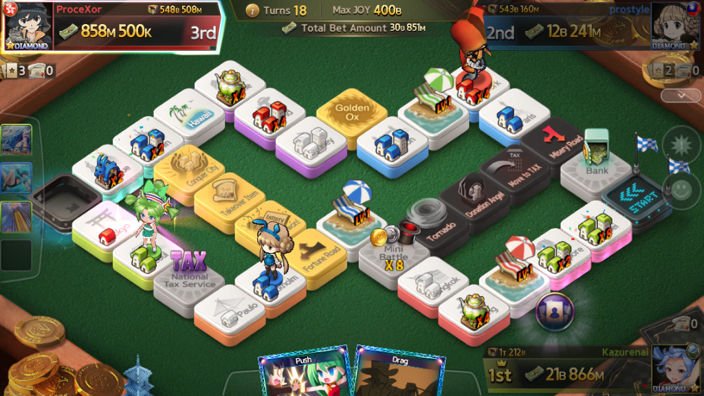 Game of Dice is an interesting strategy board game where you play against different players and bankrupt them all to win. It is a sort of monopoly meets Yu-Gi-Oh as the aim is to get around the board, earn money, buy properties and make sure your opponent loses money and goes bankrupt – with the addition of skill cards to give you advantages like gaining money, moving character pieces or increasing your property income. There are different game modes and also different maps with different focuses (such as ones that increase money by the thousands, making it a quicker match.) There is of course, a gacha for new characters, new dice and new cards with skills that you can adapt best to your own play style. Of course, there are some problems with RNG and luck but that’s just how any game works.