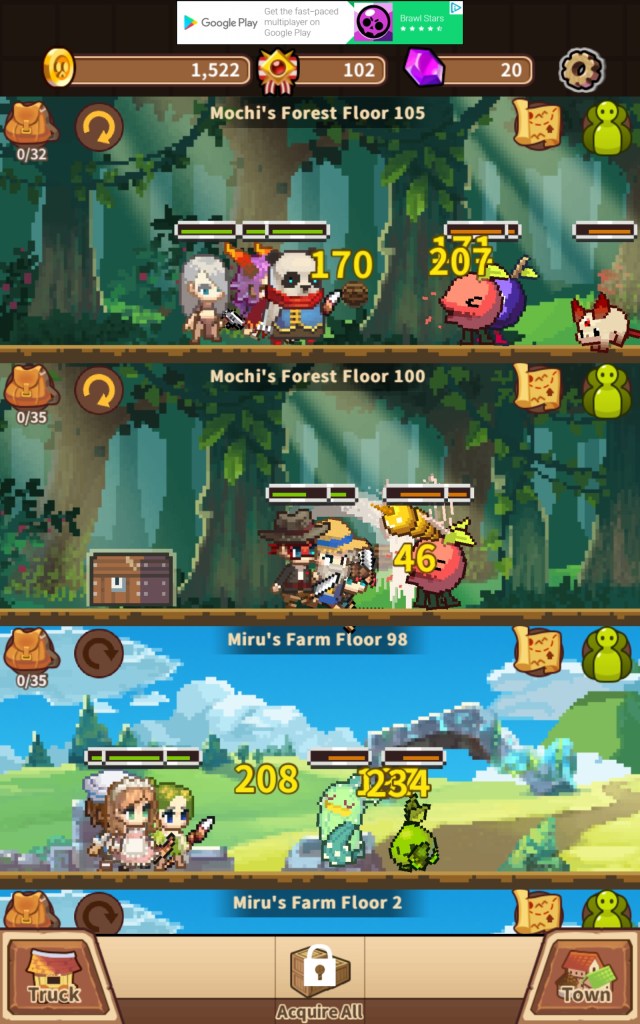 Cooking Quest is an RPG management games and while there is a few wait times, there is a lot to do.. The plot is set in a world where… there is no food (I… That’s just what it is). The main character, on his last legs, is saved by a random bear chef (Again, don’t question it) that saves his life by feeding him. He then decides that with the help of his bear chef, he will set up a travelling food wagon to sell dishes around the world. The game is split into 3 separate screens, helping you to organise yourself with something new happening in each screen from managing your wagon to the “real” gameplay, which are the dungeons. You hire adventurers via gacha who automatically fight through them, getting ingredients for your wagon. If they are defeated, they restart a few levels down and won’t progress unless you spend some gold to improve their armour, weapon and stats. There are 6 towns to unlock, which in turn unlock new recipes. You can use the money you earn to unlock more chefs, dungeon slots and even the design of your wagon. The ads are not intrusive at all, coming in the form of little balloons you can “pop” to receive bonuses such as ingredients, gold or an increase of customers. Definitely the definition of bite-sized enjoyment, the game will have you managing your screens like you’re managing some pans. (Terrible pun, let’s not dwell on it too long.)