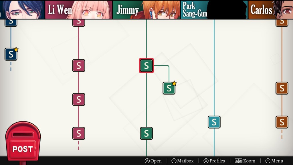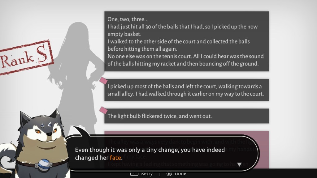 The game takes the concept of VN flowcharts, normally used in text-heavy VNs with different routes (i.e. Fate series), and seamlessly integrates it as letters that are received as a result of achieving a certain outcome for each character’s letter. Each letter is a plea that a character makes to the ‘God’ and thus if no more pleas are made, then no more letters will be recieved.